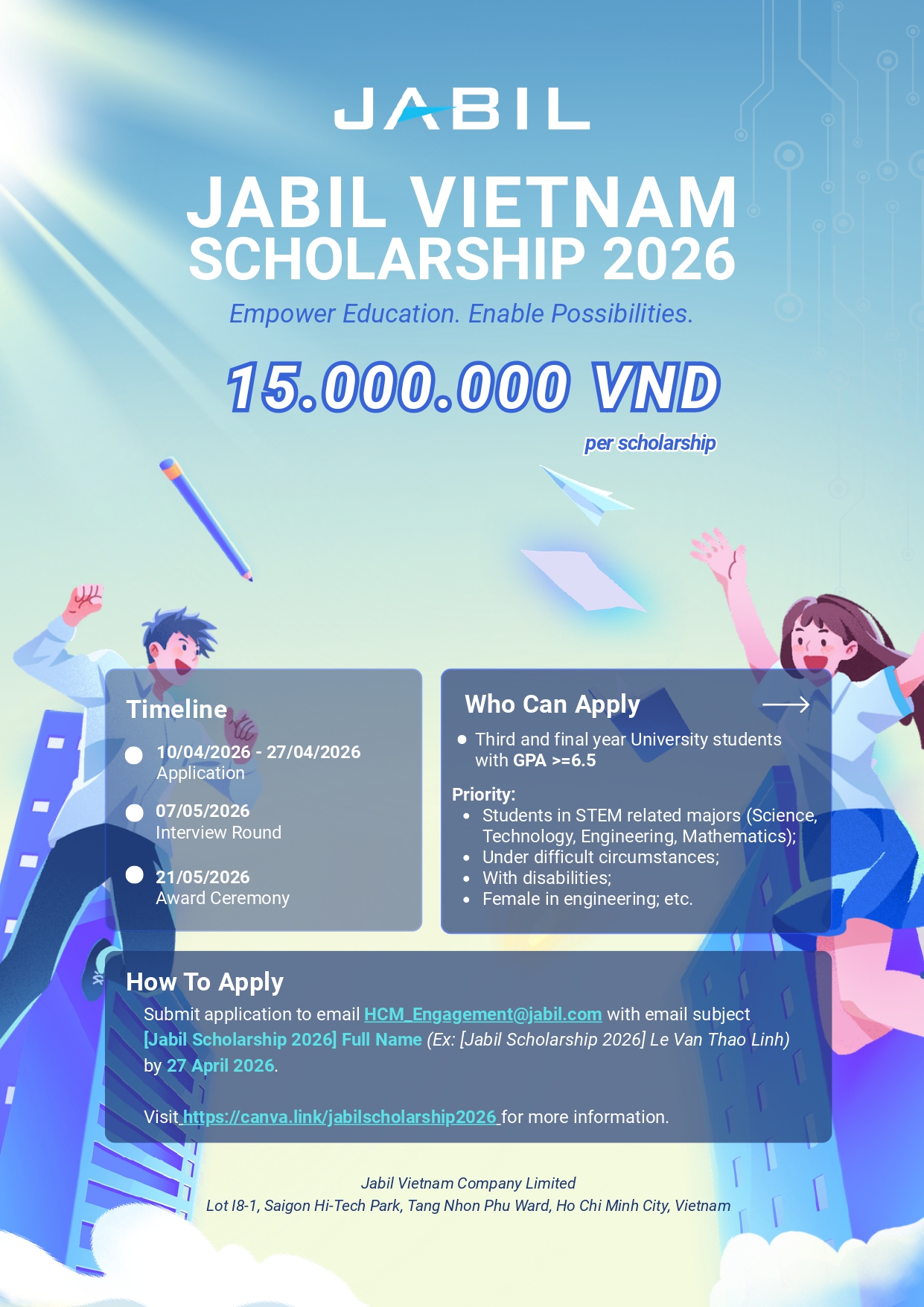 Với mong muốn đóng góp cho xã hội và hỗ trợ tài chính cho các sinh viên đại học có hoàn cảnh khó khăn, Công ty TNHH Jabil Việt Nam tổ chức chương trình “Học bổng Jabil Việt Nam 2026”. Đây là năm thứ ba của chương trình học bổng và Jabil Việt Nam mong muốn tiếp tục hợp tác mật thiết với nhà trường trong chương trình này.