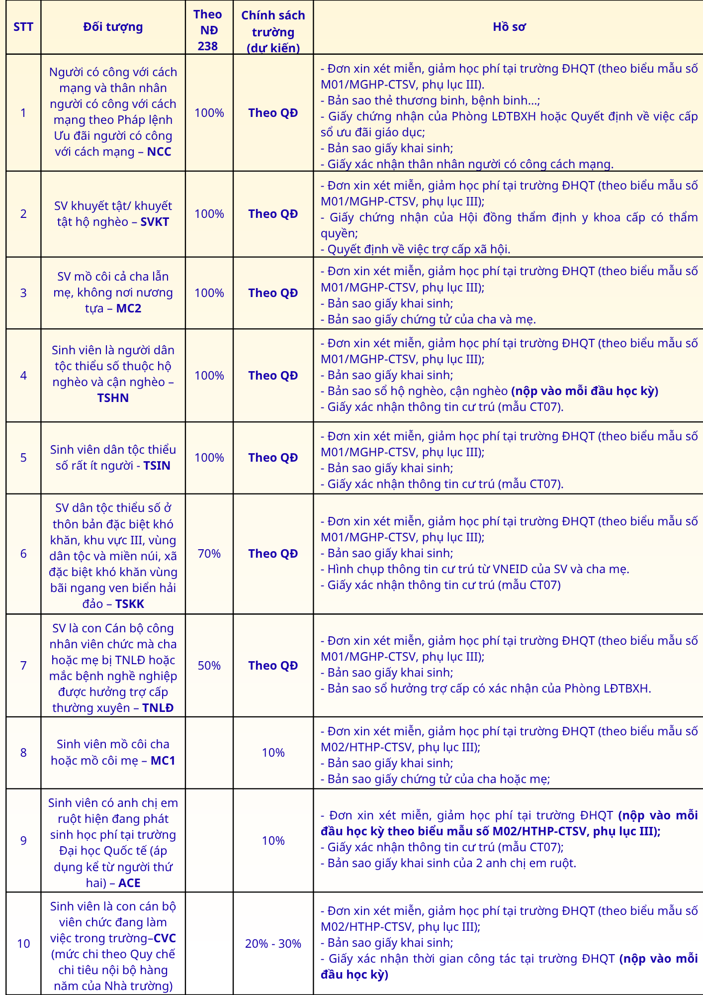 – Các đối tượng cần bổ sung vào đầu mỗi học kỳ. + ACE: mẫu đơn theo biểu mẫu số M02/HTHP-CTSV. + CVC: Giấy xác nhận thời gian công tác tại trường ĐHQT. + TSHN: Bản sao sổ hộ nghèo, cận nghèo.