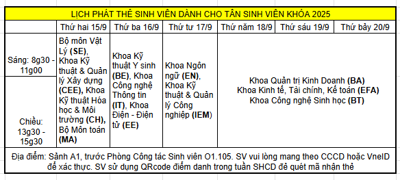Phòng Công tác Sinh viên thông báo về việc phát thẻ sinh viên dành cho tân sinh viên (TSV) Khóa 2025 như sau: